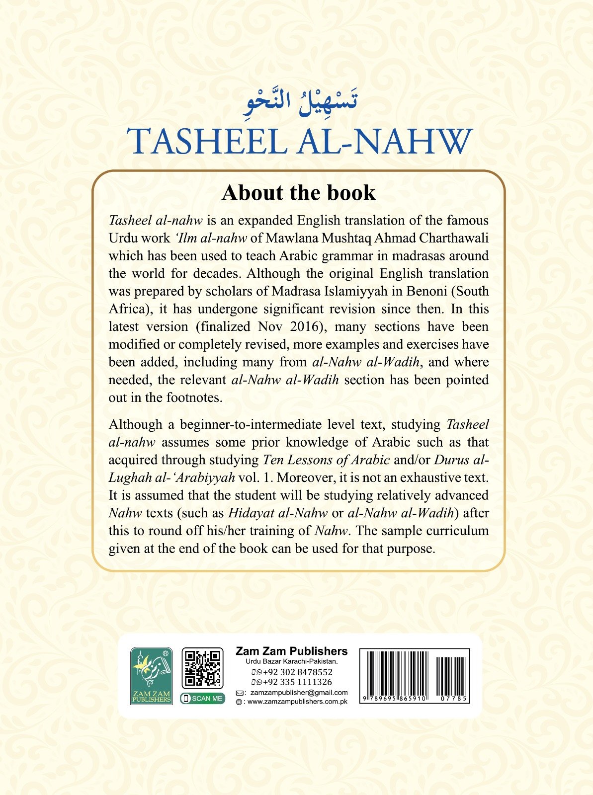 Tasheel al-ahw is a expaded Eglish traslatio of the famous Urdu work ‘Ilm al-ahw of Mawlaa Mushtaq Ahmad Charthawali which has bee used to teach Arabic grammar i madrasas aroud the world for decades. Although the origial Eglish traslatio was prepared by scholars of Madrasa Islamiyyah i Beoi (South Africa), it has udergoe sigificat revisio sice the. I this latest versio (fialized Nov 2016), may sectios have bee modified or completely revised, more examples ad exercises have bee added, icludig may from al-Nahw al-Wadih, ad where eeded, the relevat al-Nahw al-Wadih sectio has bee poited out i the foototes.