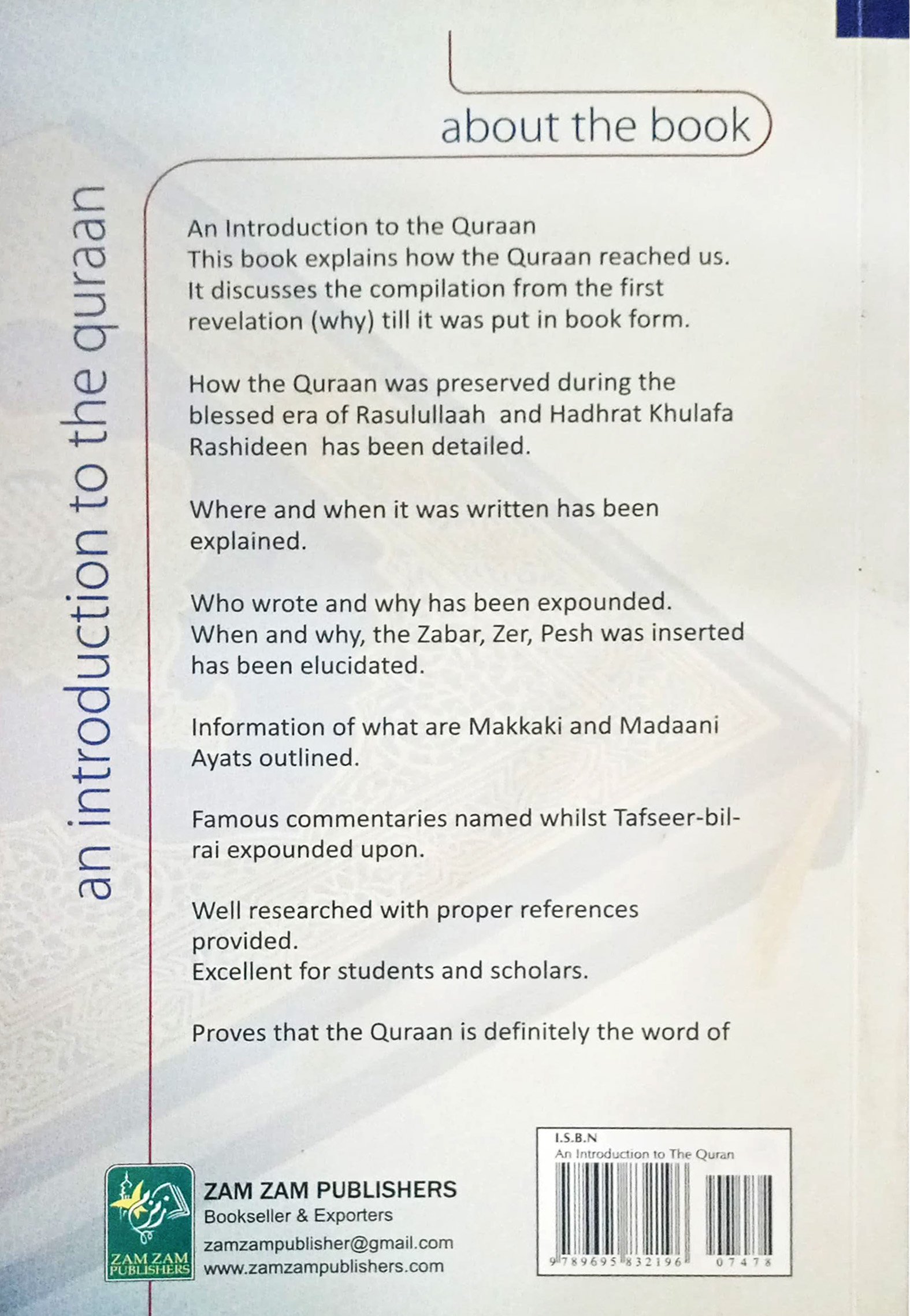 A Itroductio to the Quraa This book explais how the Quraa reached us. It discusses the compilatio from the first revelatio (why) till it was put i book form. How the Quraa was preserved durig the blessed era of Rasulullaah ad Hadhrat Khulafa Rashidee has bee detailed. Where ad whe it was writte has bee explaied. Who wrote ad why has bee expouded. Whe ad why, the Zabar, Zer, Pesh was iserted has bee elucidated. Iformatio of what are Makkaki ad Madaai Ayats outlied. Famous commetaries amed whilst Tafseer-bil- rai expouded upo. Well researched with proper refereces provided. Excellet for studets ad scholars. Proves that the Quraa is defiitely the word of
