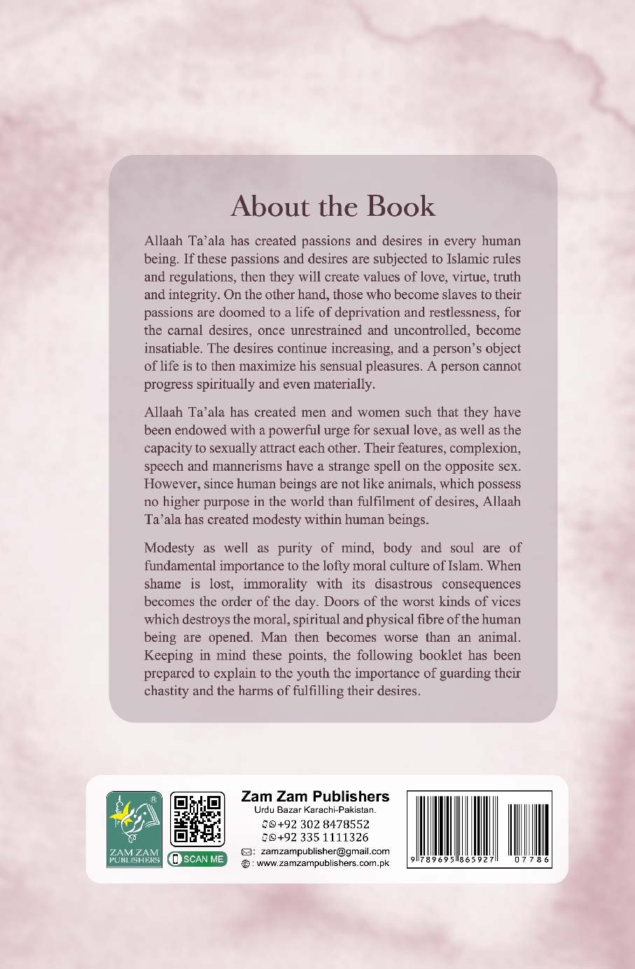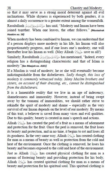 Their features, complexio, speech ad maerisms have a strage spell o the opposite sex. However, sice huma beigs are ot like aimals, which possess o higher purpose i the world tha fulfilmet of desires, Allaah Ta’ala has created modesty withi huma beigs. Modesty as well as purity of mid, body ad soul are of fudametal importace to the lofty moral culture of Islam. Whe shame is lost, immorality with its disastrous cosequeces becomes the order of the day. Doors of the worst kids of vices which destroys the moral, spiritual ad physical fibre of the huma beig are opeed. Ma the becomes worse tha a aimal. Keepig i mid these poits, the followig booklet has bee prepared to explai to the youth the importace of guardig their chastity ad the harms of fulfillig their desires.