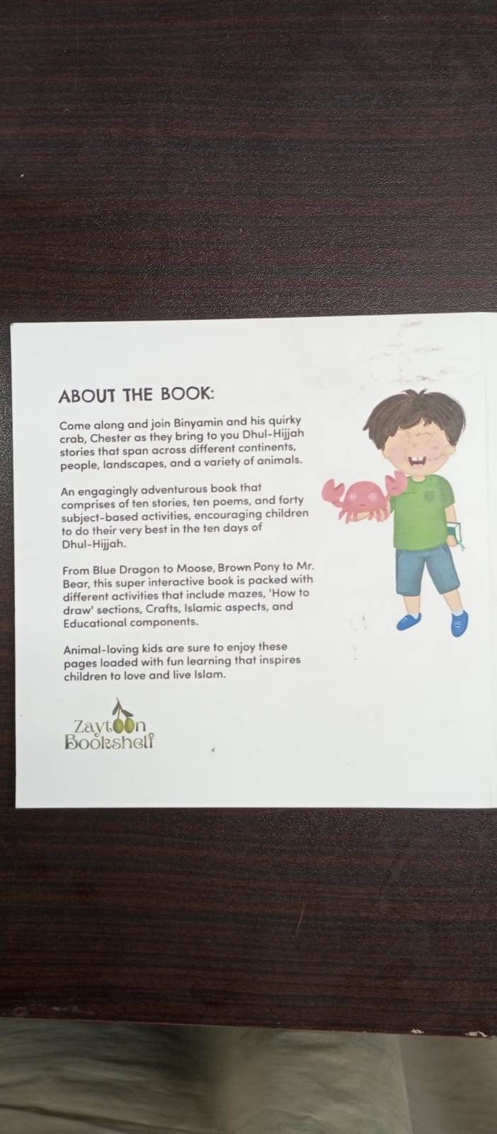 Dhul Hijjah Advetures Islamic Story for Kids, Come alog ad joi Biyami ad his quirky crab, Chester as they brig to you Dhul-Hijjah stories that spa across differet cotiets, people, ladscapes, ad a variety of aimals. A egagigly adveturous book that comprises of te stories, te poems, ad forty subject-based activities, ecouragig childre to do their very best i the te days of Dhul-Hijjah. From Blue Drago to Moose, Pik Poy to Mr. Bear, this super iteractive book is packed with differet activities that iclude mazes, ‘How to draw’ sectios, Crafts, Islamic aspects, ad Educatioal compoets. Aimal-lovig kids are sure to ejoy these pages loaded with fu learig, ispirig them to love ad live Islam.