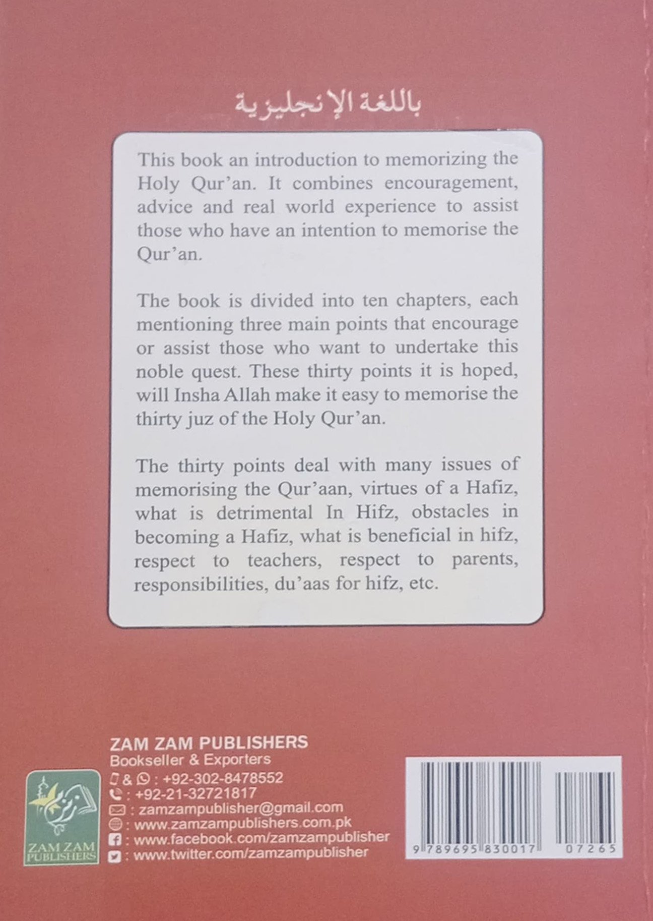 The book is divide ito te chapters, each metioig three mai poits that ecourage or assist those who wat to udertake this oble quest. These thirty poits it is hope, will Ishallah make it easy to memories the thirty juz of the Holy Qura.
