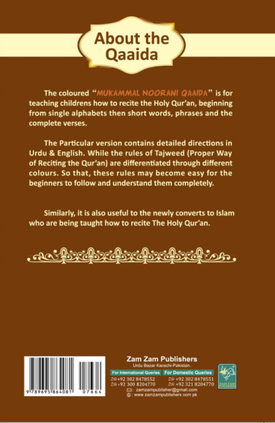 The Coloured “Mukammal Noorai Qaida” is for teachig childres how to recite the holy Qura, begiig from sigle alphabets the short words, phrases ad the complete verses.