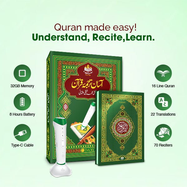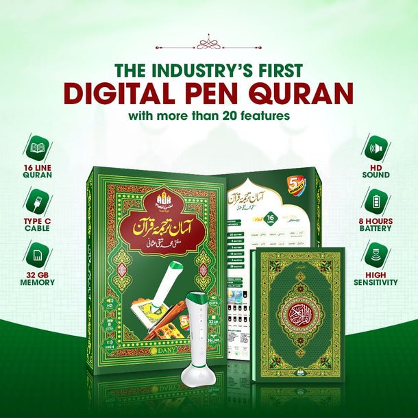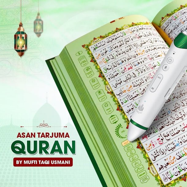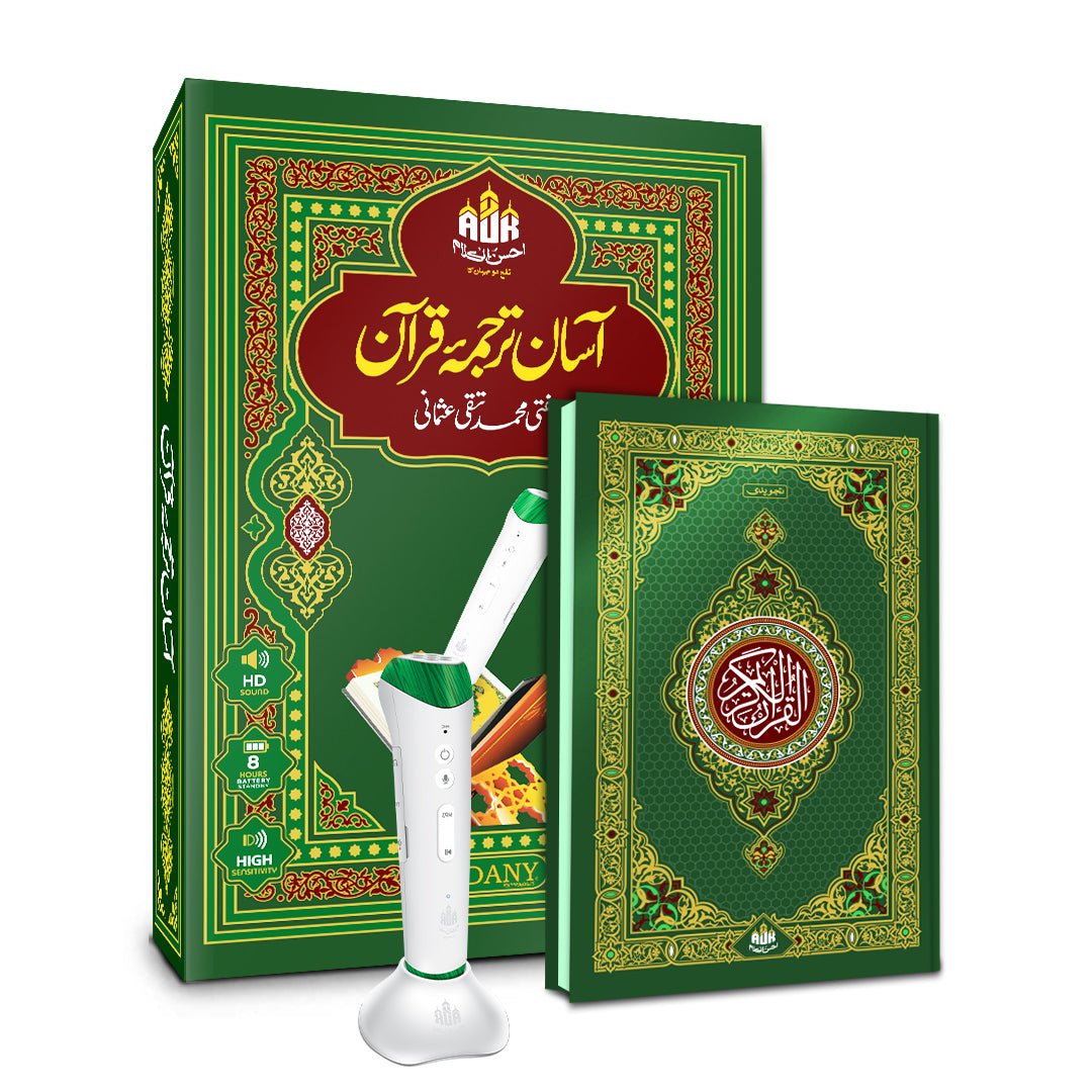 This premium set features the renowned Asan Tarjuma-e-Quran by Mufti Muhammad Taqi Usmani, known for its simple, clear, and easy-to-understand Urdu translation. It is paired with an advanced Digital Quran Pen, making it an ideal companion for students, children, and adults looking to improve their Tajweed and comprehension.