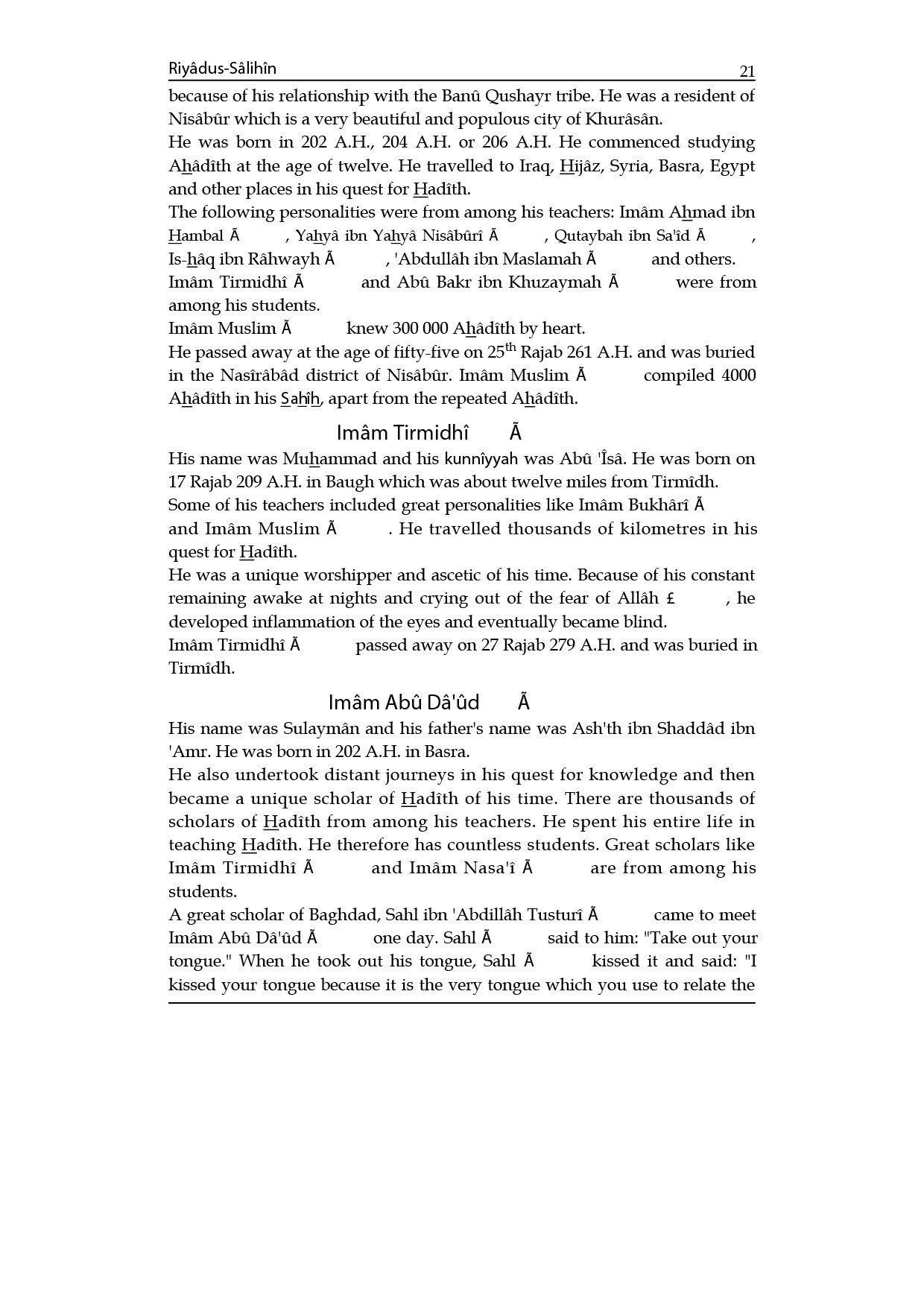 We feel it ecessary to provide a short life-sketch of the compilers of Hadith because it is their arratios that are cotaied i this book, Riyad as-salihi.
