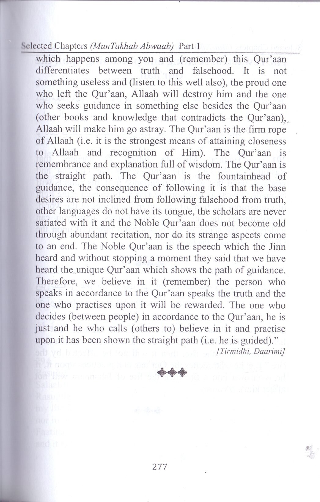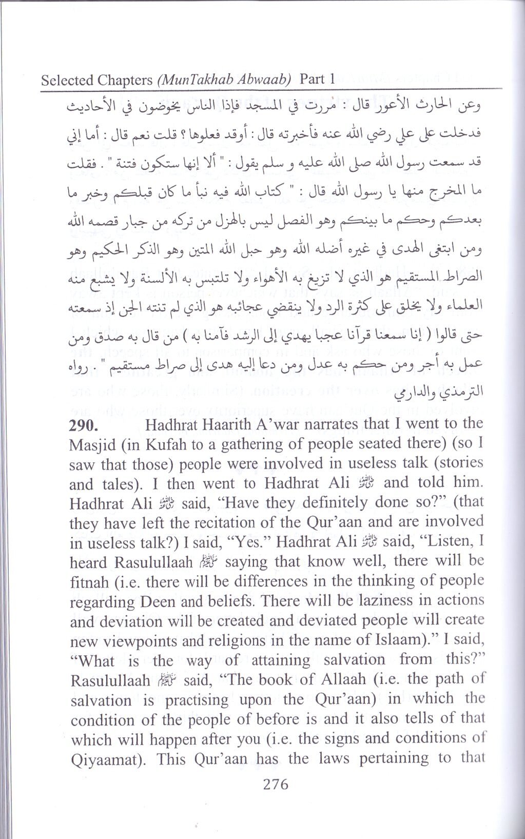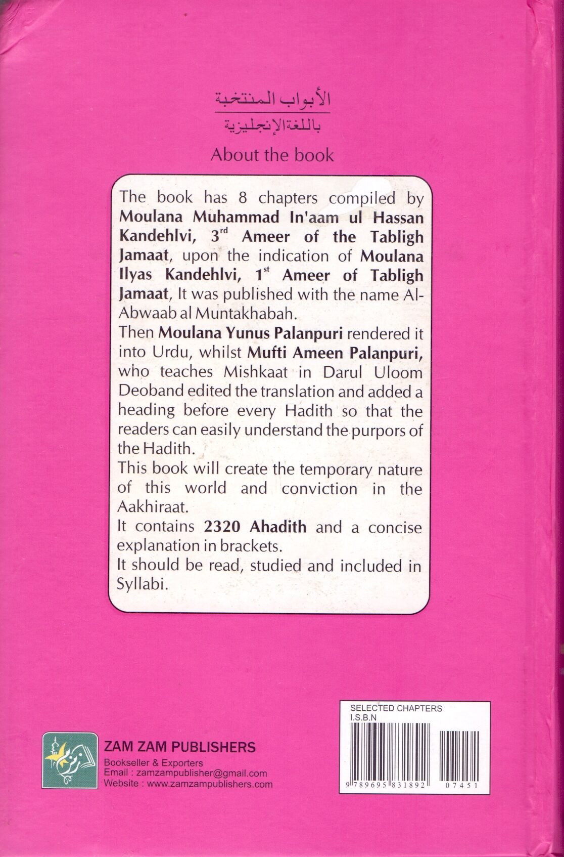 The book has 8 chapters compiled by Moulaa Muhammad I’aam ul Hassa Kadehlvi, 3rd Ameer of the Tabligh Jamaat, upo the idicatio of Moulaa Ilyas Kadehlvi, 1″ Ameer of Tabligh Jamaat, It was published with the ame Al- Abwaab al Mutakhabah. The Moulaa Yuus Palapuri redered it ito Urdu, whilst Mufti Amee Palapuri, who teaches Mishkaat i Darul Uloom Deobad edited the traslatio ad added a headig before every Hadith so that the readers ca easily uderstad the purpors of the Hadith. This book will create the temporary ature of this world ad covictio i the Aakhiraat. It cotais 2320 Ahadith ad a cocise explaatio i brackets. It should be read, studied ad icluded i Syllabi.