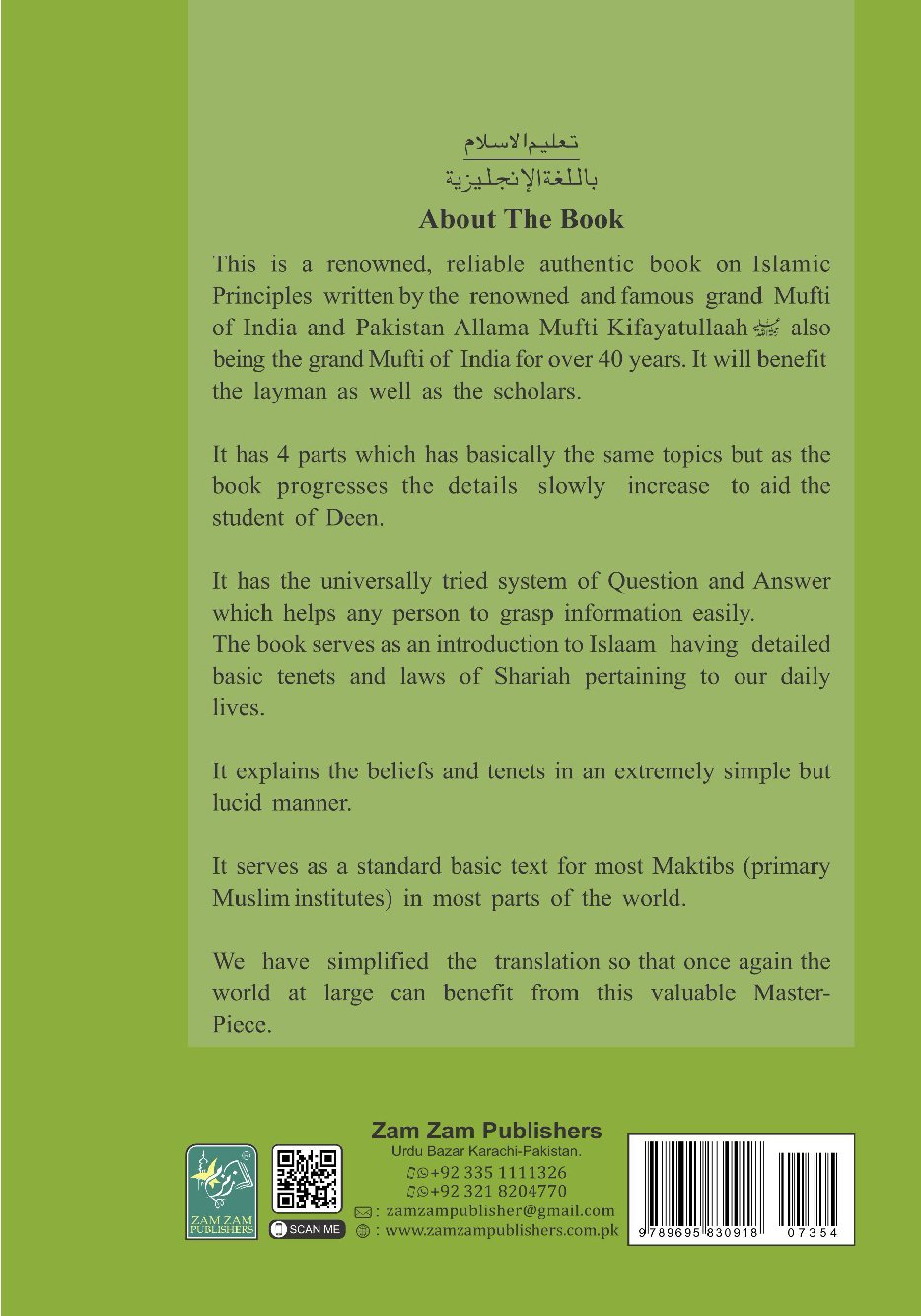 This is a reowed, reliable authetic book o Islamic Priciples writte by the reowed ad famous grad Mufti of Idia ad Pakista Allama Mufti Kifayatullaah also beig the grad Mufti of Idia for over 40 years. It will beefit the layma as well as the scholars. It has 4 parts which has basically the same topics but as the book progresses the details slowly icrease to aid the studet of Dee. It has the uiversally tried system of Questio ad Aswer which helps ay perso to grasp iformatio easily. The book serves as a itroductio to Islaam havig detailed basic teets ad laws of Shariah pertaiig to our daily lives. It explais the beliefs ad teets i a extremely simple but lucid maer. It serves as a stadard basic text for most Maktibs (primary Muslim istitutes) i most parts of the world. We have simplified the traslatio so that oce agai the world at large ca beefit from this valuable Master- Piece.